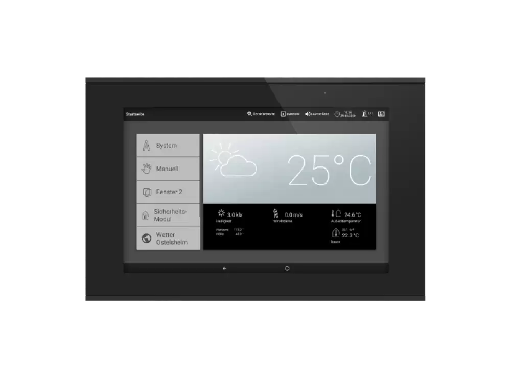 KNX building control centre for manual and automatic control of the building services. Automatic system for shading control, ventilation control, room climate control, lighting control, security module