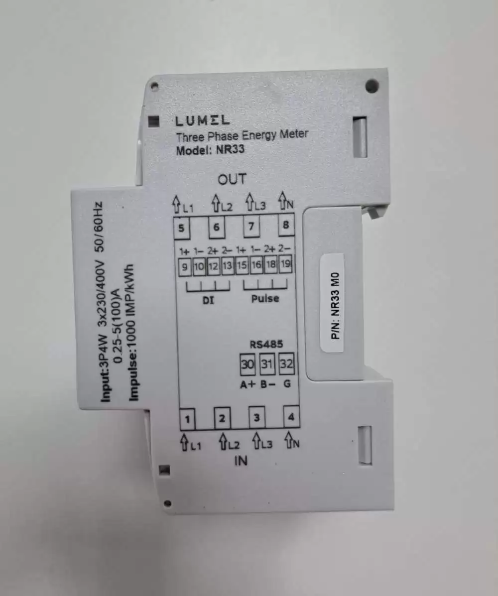 LUMEL, ENERGY METER, 3 PHASE, DIN RAIL MOUNT, DIRECT CONNECTED 100A, VOLTAGE I/P: 400V L-L, SELF POWERED, WITH RS485, 2 PULSE OUTPUTS, 2 DIGITAL INPUTS, OLD NMID30-2, NR33 M0