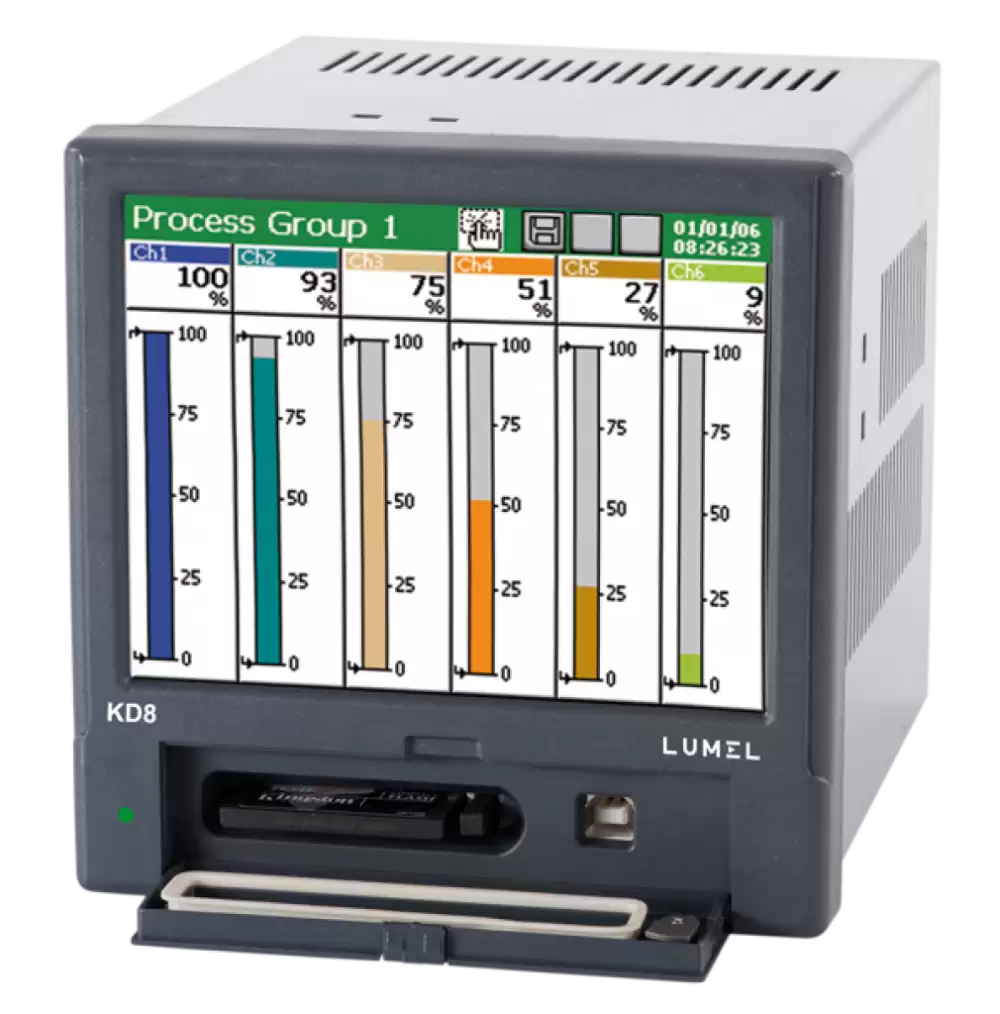 KD8 recorder is applied as a data acquisition station in measuring systems. It finds application to measure, visualize and supervise technical process parameters in various industrial branches, e.g. in pharmacy, food, chemical.Â
