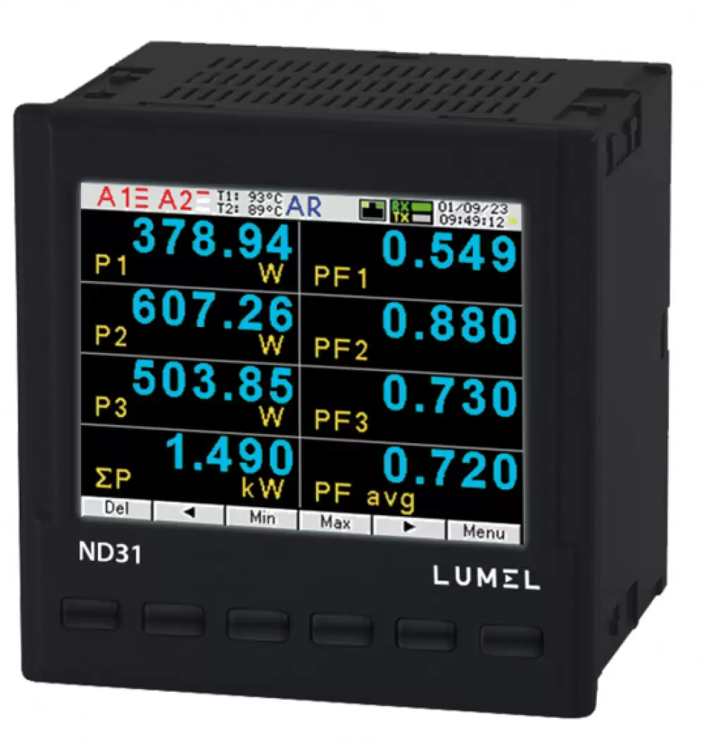 LUMEL, ND31, DATA RECORD AND MQTT IIoT, BACNET/IP OR MODBUS TCP/IP, VOLT. I/P: 3x57.7/100V, 3x230/400V, 2 RELAYS,1 ANALOG O/P,2 I/P PT100, RS485, ETHERNET, AUX. : 85-253V AC, ND31 1221M0