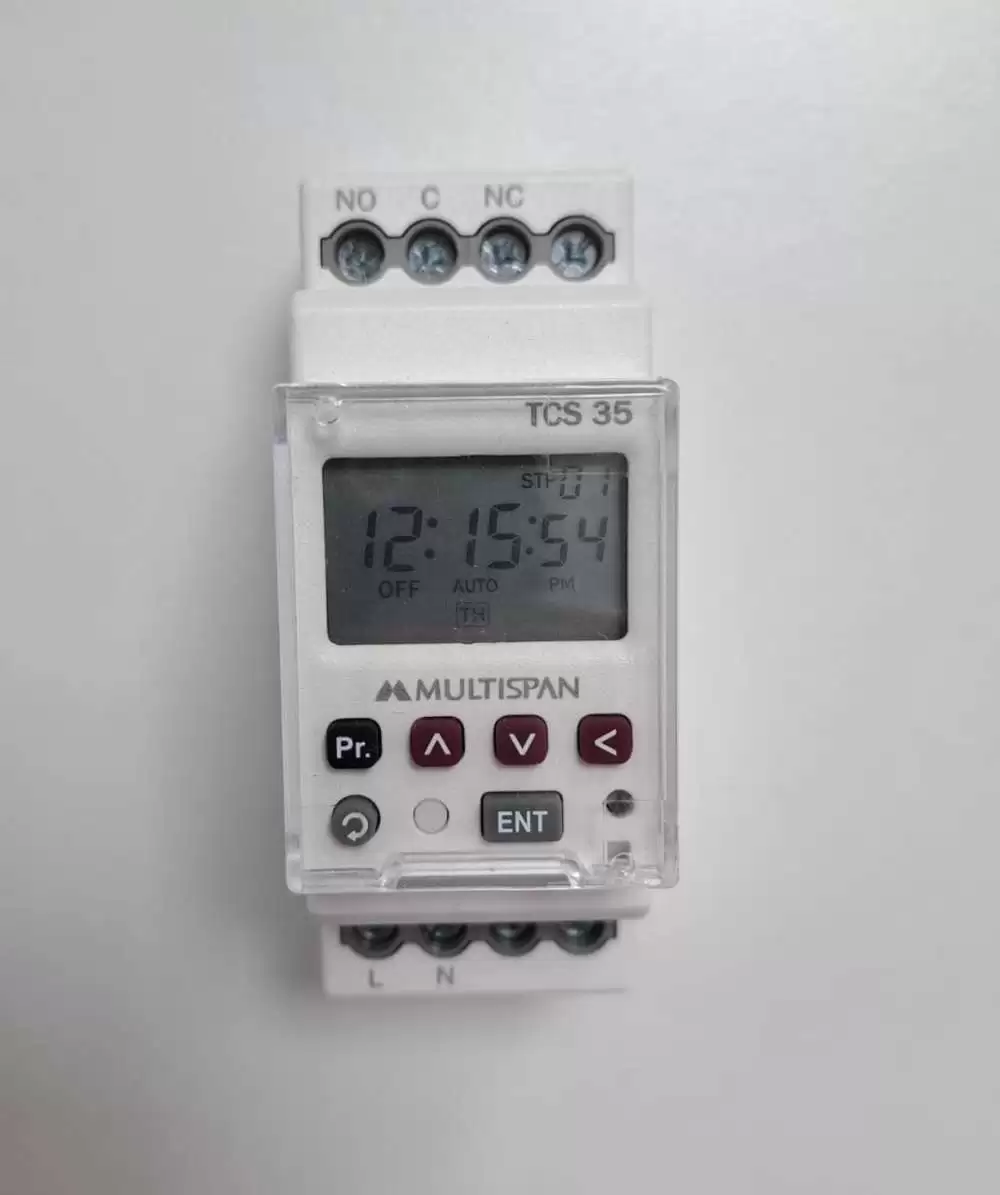 MULTISPAN, TIME CONTROL SWITCH, LCD, DIN RAIL MOUNT, 1 CHANGE OVER CONTACT, WEEKLY: TOTAL 50 ON STEPS AND 50 OFF STEPS, 24 DAYS HOLIDAY SETTING, SUPPLY VOLTAGE 230V AC, 50/60 Hz, TCS 35-B1-00