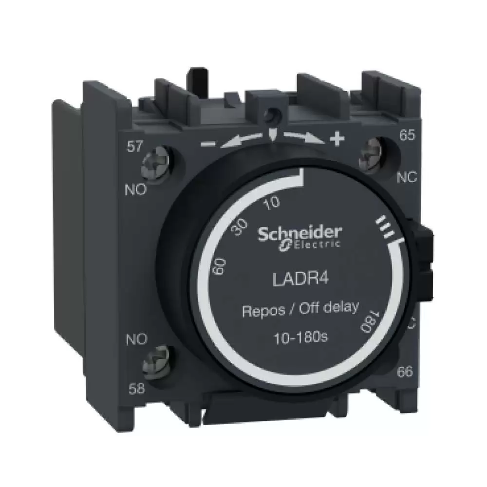 SCHNEIDER ELECTRIC, TIME DELAY AUXILIARY CONTACT BLOCK, TeSys Deca, CONTACT 1NO+1NC, OFF DELAY, 10-180s, 690V AC, IP 20, LADR4