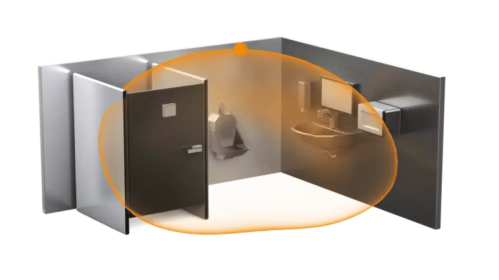 Doesn't miss a thing. HF-presence detector Presence Control PRO HF 360 COM1 AP for indoors, ideal for WCs with toilet cubicles, changing rooms, stairwells, multi-storey car parks, kitchens, installation height up to 3.5 m, surface-mounting version for switching light 'ON' and 'OFF', 1 – 12 m reach, reach is electronically adjustable and can be limited in two directions, detection regardless of temperature, HF-sensor technology also detects movement through glass, wood and stud walls.
