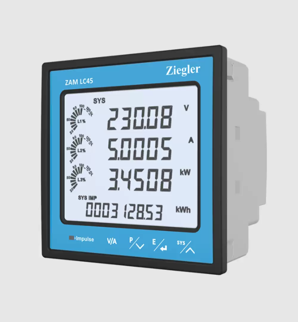 ZIEGLER, DIGITAL POWER MONITORING METER, I/P: 100VLL to 600 VLL, 1A/5A, 50/60Hz, AUXILIARY SUPPLY: 100 - 550V AC/DC, MODBUS RS485 + 2 PULSE O/P + 2 DI, ZAM LC45