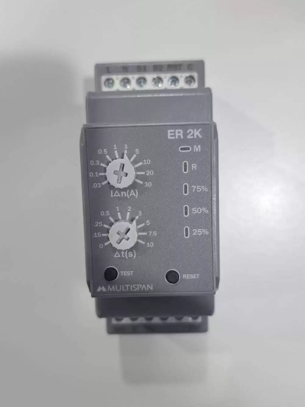 MULTISPAN, EARTH LEAKAGE RELAY, ANALOG, CURRENT SETTING: 30mA-30A, TIME DELAY: 0-10 SECOND, AUXILIARY SUPPLY: 100-270V AC, 50/60 Hz, ER 2K-A2-00