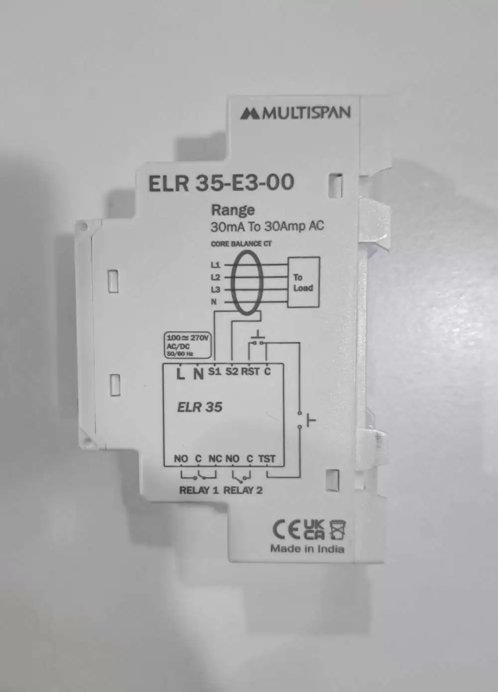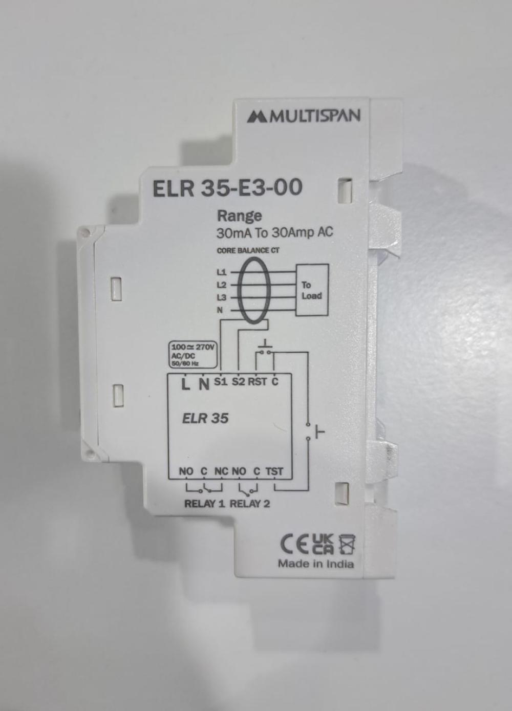 MULTISPAN, EARTH LEAKAGE RELAY, DIGITAL, LED, CURRENT I/P: 30mA-30A, TIME DELAY: 0-9.99 SECOND, RELAY CONTACTS: 1 CO+1NO, AUXILIARY SUPPLY: 100-270V AC/DC, ELR 35-E3-00
