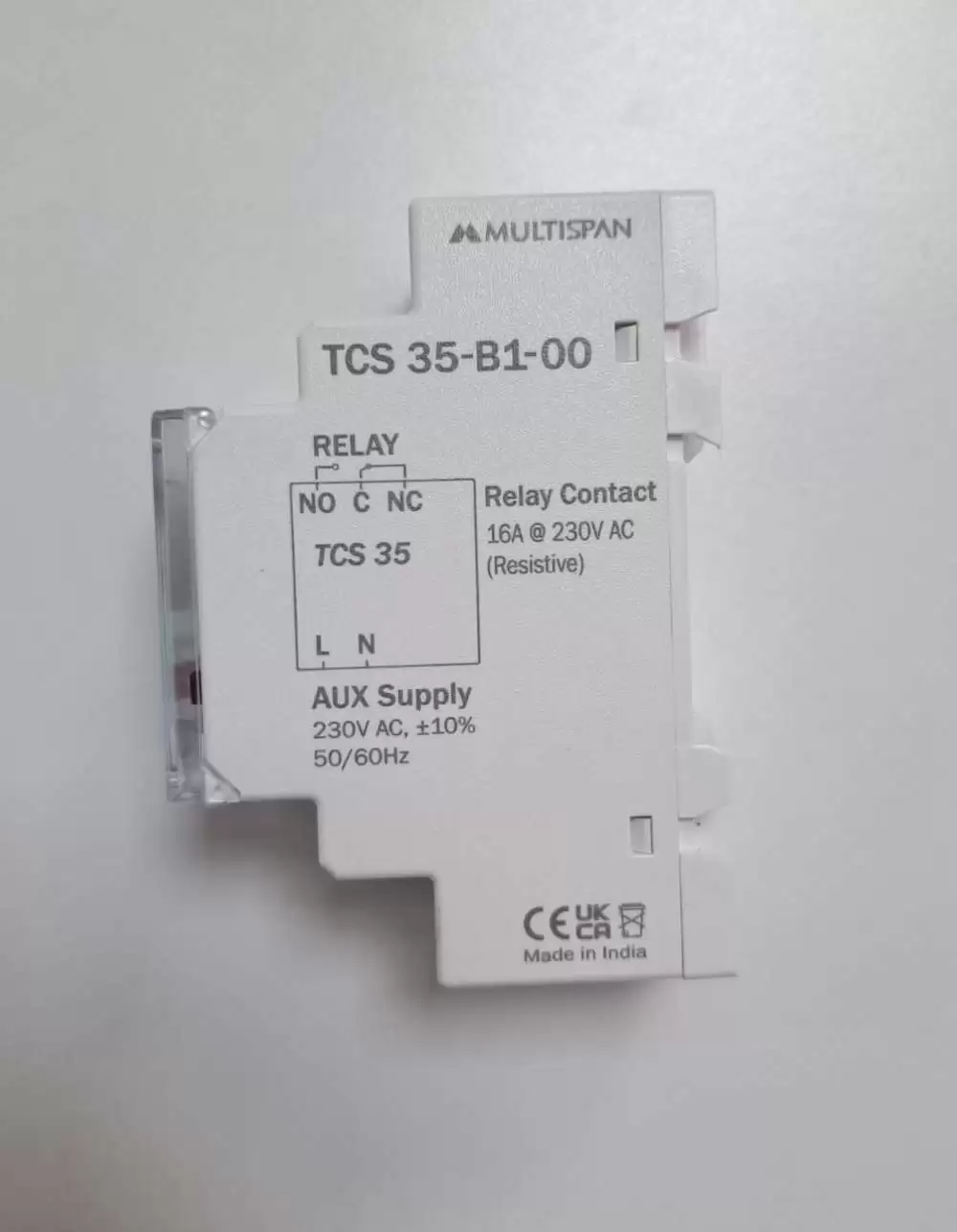 MULTISPAN, TIME CONTROL SWITCH, LCD, DIN RAIL MOUNT, 1 CHANGE OVER CONTACT, WEEKLY: TOTAL 50 ON STEPS AND 50 OFF STEPS, 24 DAYS HOLIDAY SETTING, SUPPLY VOLTAGE 230V AC, 50/60 Hz, TCS 35-B1-00
